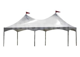 This 20'x 30' high-peak frame tent is set up using tension cross cables to support the center pole with no center poles on the floor. This design provides a high-peak elegant looking and clear open floor.